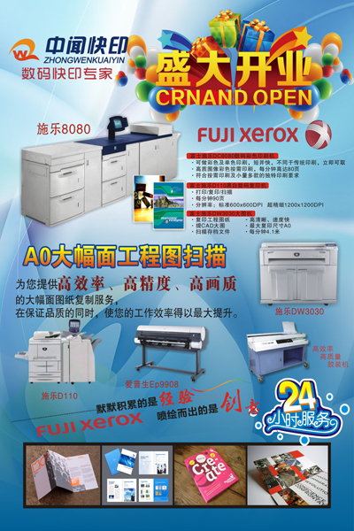公司秉承“顾客至上,质量第一”的经营理念,依托中闻传媒品牌实力,辅以富士施乐的高端的技术支持,以更快、更优、便捷的服务,真正做到随时、随需、随印。为新老客户提供更为周到、细致、完善的服务。公司主要设备有:施乐DC8080,施乐黑白D110,工程复印机DW3030,爱普生9908高精度绘图仪;印后加工设备有:高端胶装机、覆膜机、切纸机、精装、蝴蝶装一体机以及各种辅助印后加工设备等。