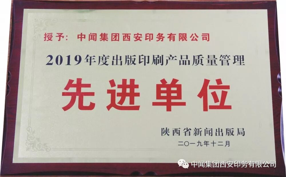 2019年度,陕西省新闻出版局组织开展了2019年“3•15”质检活动和中小学重点教材检查工作,开展了2018年—2019年上半年出版印刷产品质量检测活动,严把中小学重点教材和省内出版印刷产品的质量关,并对在“3•15”质检活动中取得突出成绩的10家出版单位、10家印刷企业授予“2019年出版产品质量管理先进单位”称号;中闻集团西安印务有限公司榜上有名。